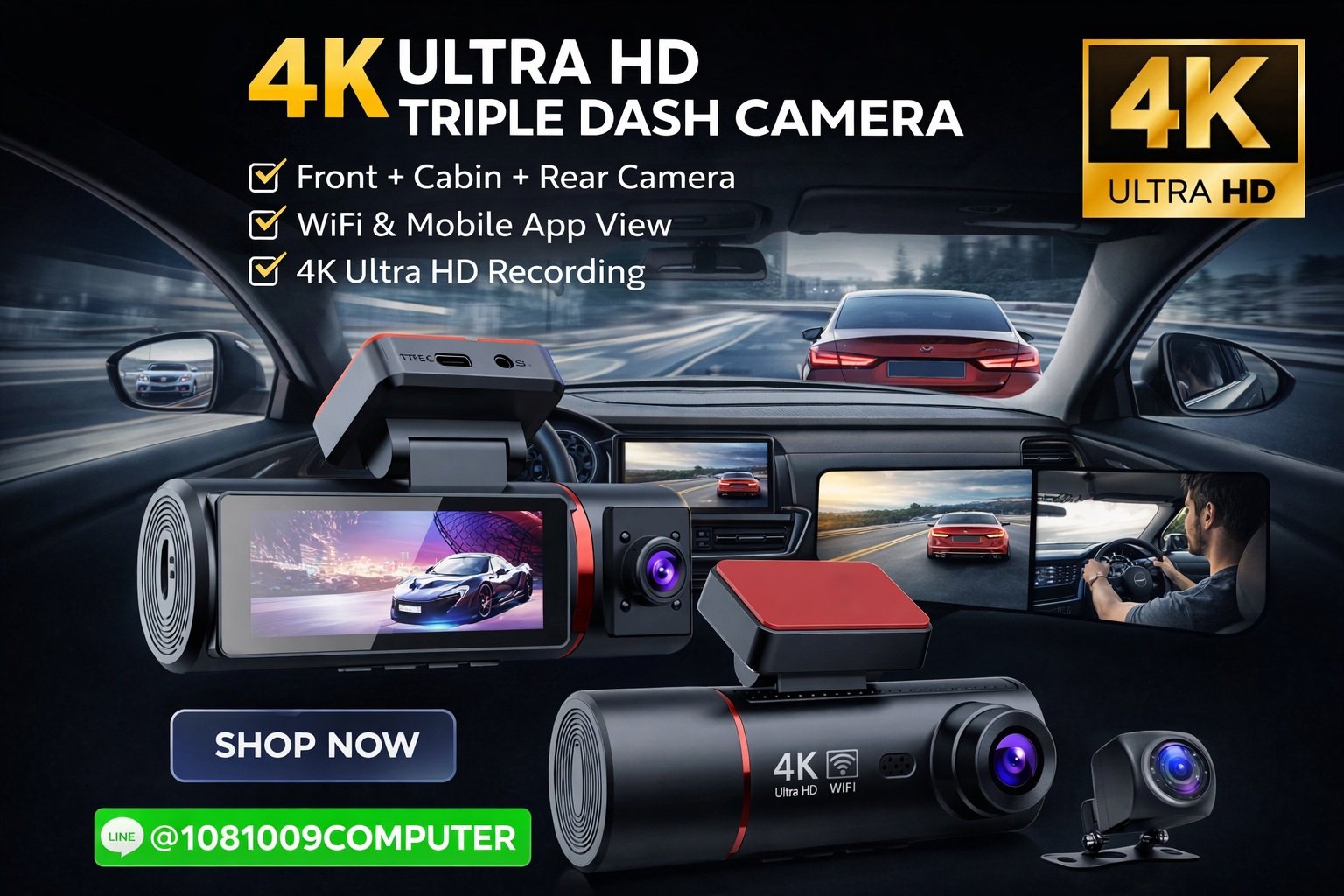 ล้องติดรถยนต์ 3 กล้อง 4K Ultra HD มองเห็นหน้ารถ ภายใน และท้ายรถ เชื่อมต่อ WiFi ดูผ่านมือถือได้ทันที